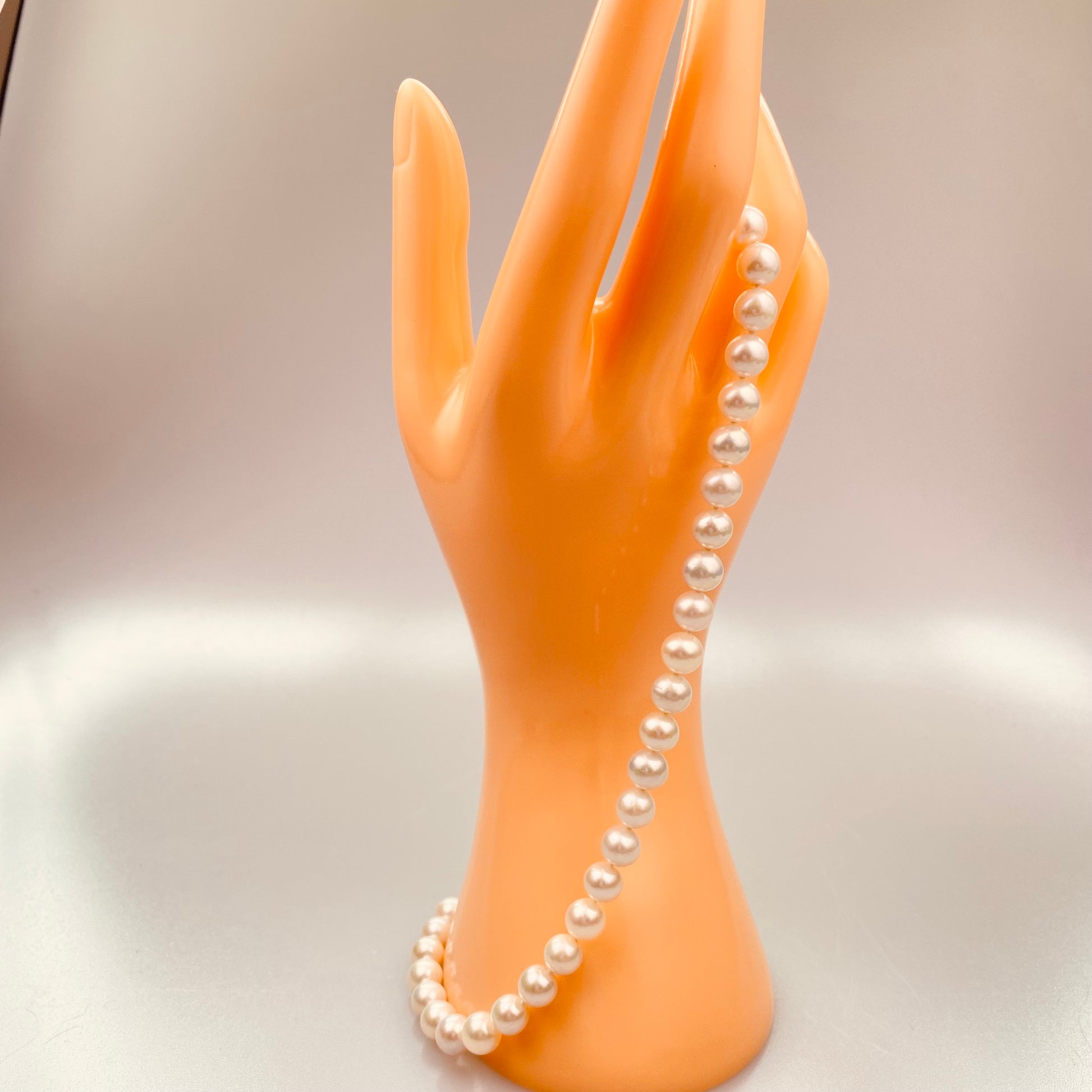 By far our most sought-after design, this white freshwater pearl necklace embodies timeless sophistication and versatility. Crafted with precision in our Los Angeles studio, each 8-9mm pearl boasts a radiant luster and subtle iridescence, creating a captivating glow that complements any outfit or occasion