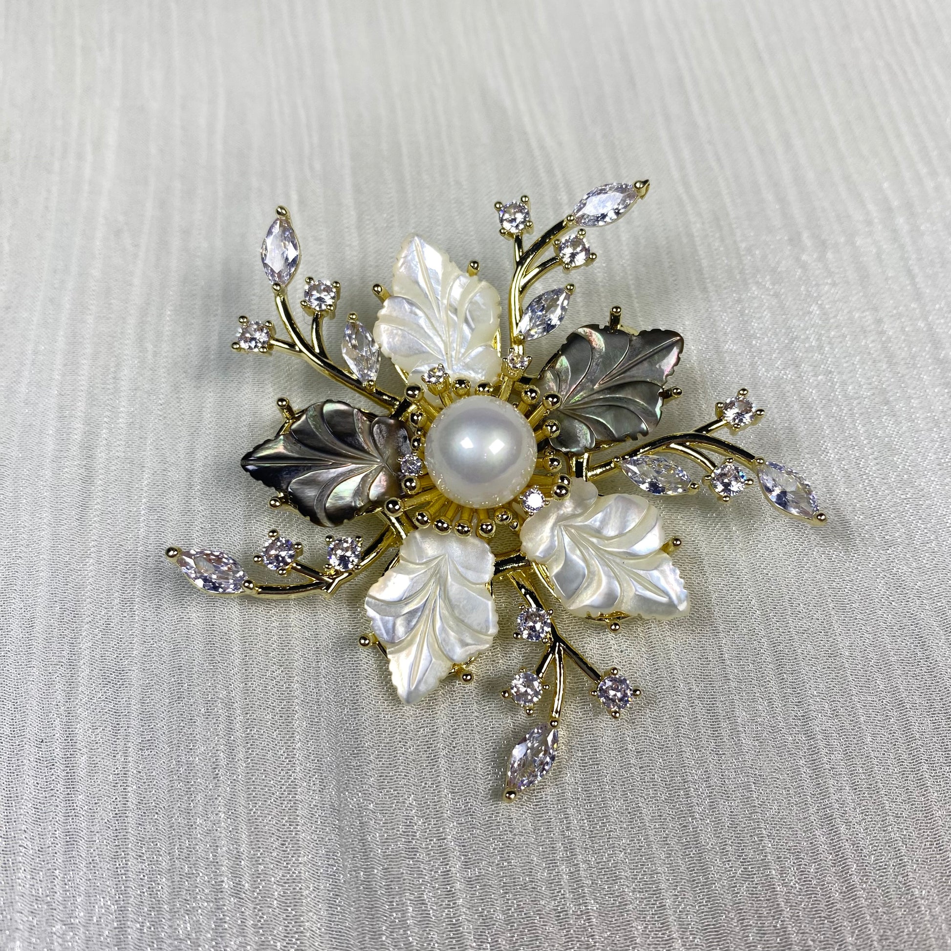 Nacrebloom Flowers Brooches, Freshwater Pearl Brooch 8.5mm-9.0mm Inlaid shell petal pin, wedding gift, High-quality pearl brooch